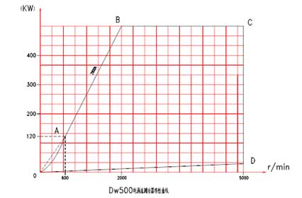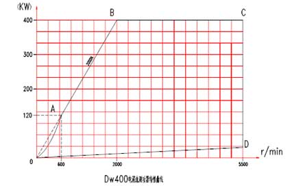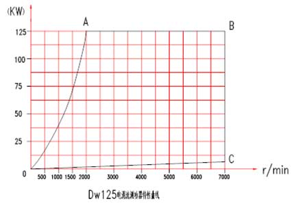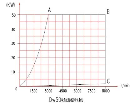 2.特性曲線 DW系列電渦流測(cè)功機(jī)特性曲線表示測(cè)功機(jī)在不同轉(zhuǎn)速下所能吸收的功率范圍,它由OABC組成。 OA—最大扭矩線。當(dāng)最大扭矩為常數(shù)時(shí)所能吸收的最大功率,隨著轉(zhuǎn)速的增加而上升,在A點(diǎn)達(dá)到扭矩強(qiáng)度所允許的最大功率。 AB—最大功率線。測(cè)功機(jī)達(dá)到最大扭矩點(diǎn)(A)后,隨著轉(zhuǎn)速的變化測(cè)功機(jī)所允許吸收的最大功率。 BC—最高轉(zhuǎn)速線。測(cè)功機(jī)在工作時(shí)允許的最高轉(zhuǎn)速。 上述三段限線所包圍的區(qū)域?yàn)闇y(cè)功機(jī)的工作范圍。凡動(dòng)力機(jī)或其它機(jī)械設(shè)備的動(dòng)力特性在OABC所包圍的范圍內(nèi)者,均能用該型測(cè)功機(jī)進(jìn)行特性試驗(yàn),用戶在選用測(cè)功機(jī)時(shí)須稍留有余地。但余地太大,測(cè)試精度則難以保證。 或由OABCD組成,則AB線為主軸強(qiáng)度所容許的最大扭矩值,其余BC、CD線含意同上。